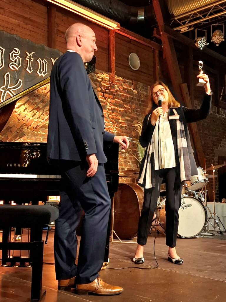 Bochum, 6. Juni 2025:  Die Stiftung Kinderzentrum Ruhrgebiet hat gestern Abend ihren Botschafter, den renommierten Künstler und Jazz-Musiker Chris Hopkins für sein einjähriges Engagement geehrt. Am Abend des 05.06.2025 wurde ihm auf dem Konzert seiner beliebten Reihe „Kemnade Swing Nights“ auf der Wasserburg Haus Kemnade von der Stiftungsvorsitzenden Angela Siebold als Dankeschön ein Oskar überreicht.
